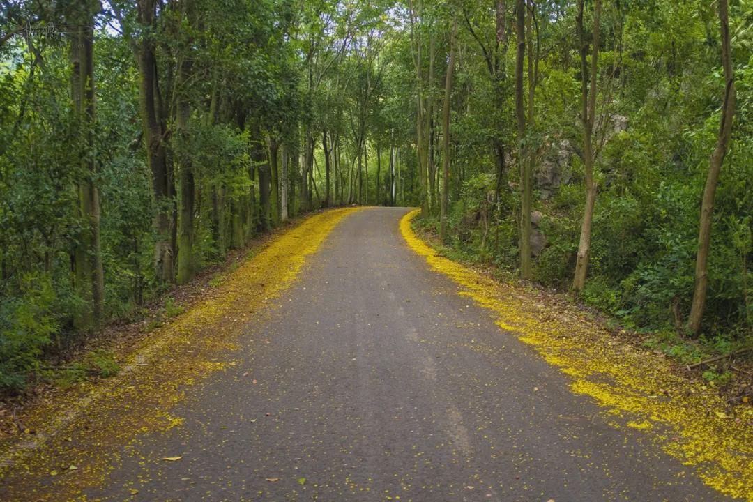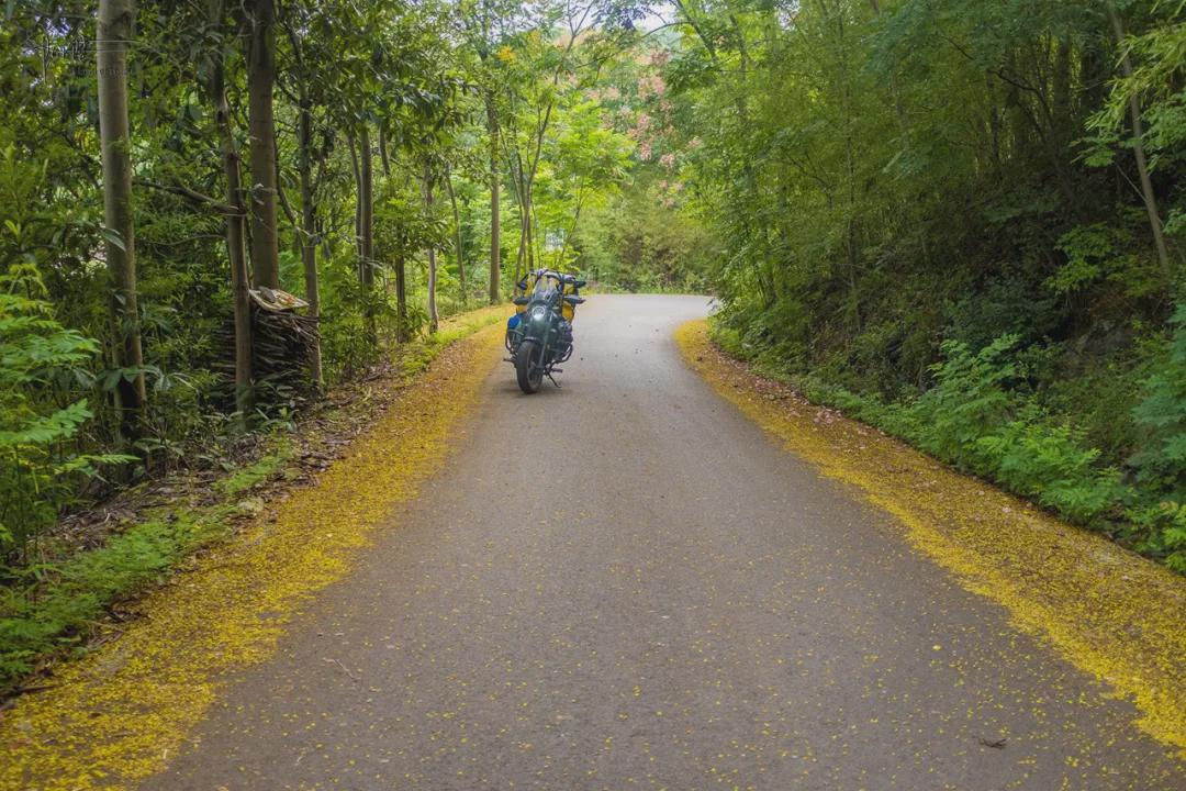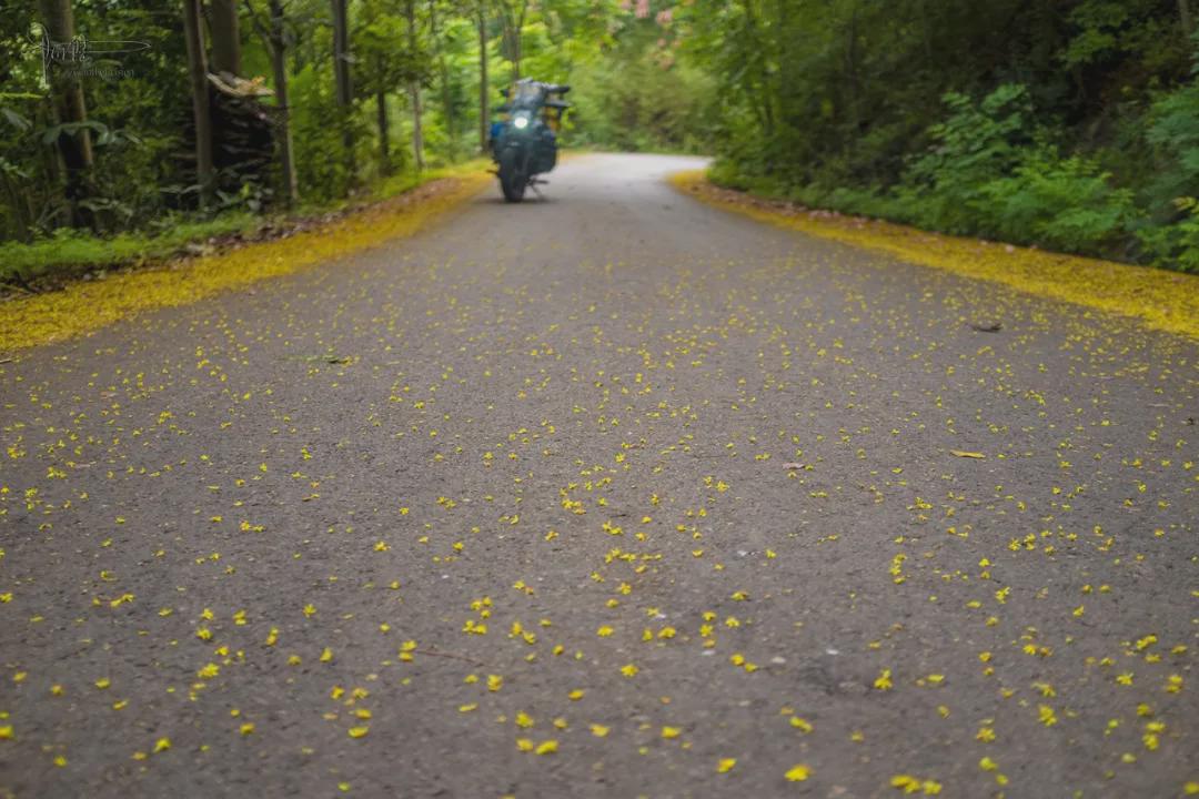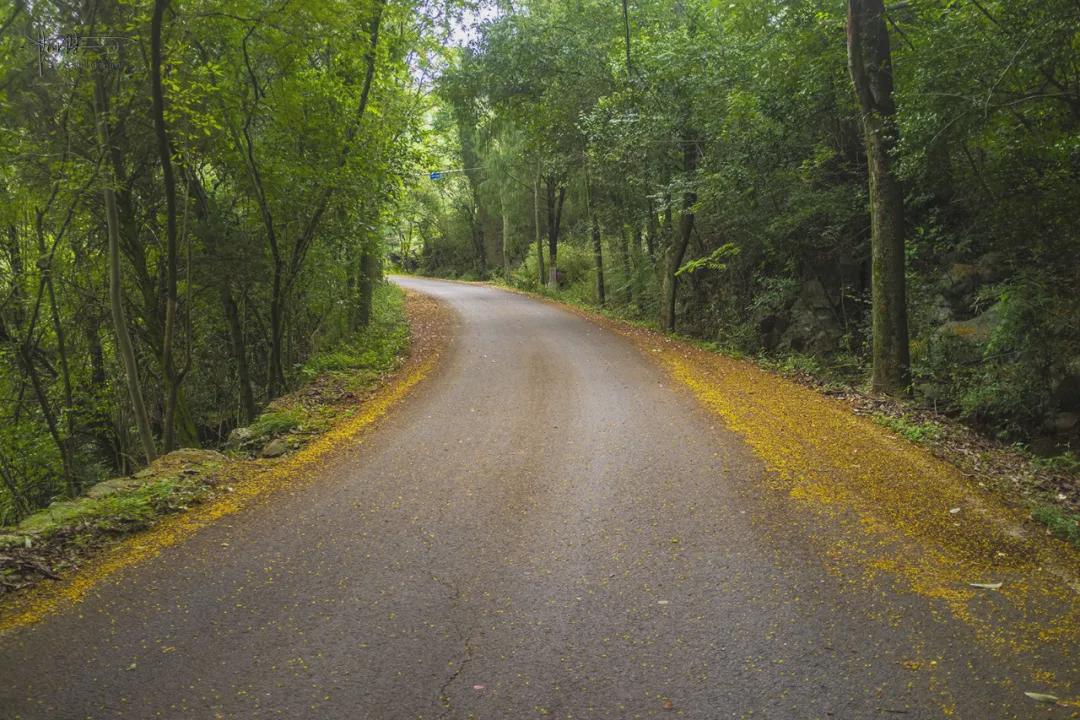 026县道的车流量不大,只偶尔才会有小车或者当地村民的农用三轮车经过,所以大部分落叶花瓣都只被略微地“扫”至道路两边,它们宛如鲜艳的地毯一般融合配资,把整条山路渲染地就像是一幅幅生动油画,行车穿梭在郁郁葱葱的林间,整体环境不单清新自然还充满生机,能给人带来一种宁静致远的森林氛围,这种感觉确实有点别具一格。