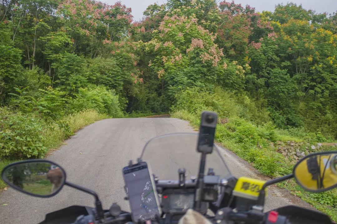 让我非常意外的是,这条小路其实是当地的026县道,蜿蜒曲折穿越数个村庄,全线几乎种满了“全冠栾树”(事后做功课查的)。恰逢夏秋交替,正是这种奇特苗木最落英缤纷又最多彩多姿的时节,而最令人惊艳的,便是这些散落满地的黄色小花。