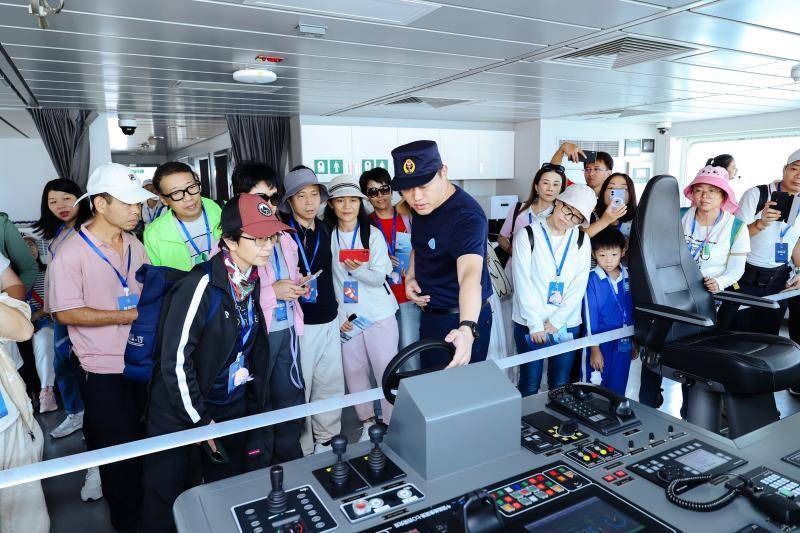 深圳市海洋综合执法支队执法人员化身讲解员,带领市民参观该船主题展厅、驾驶舱、中央指挥室等区域,讲述中国渔政44002船建造背景、性能参数、功能职责等有关知识。活动中,市民纷纷登上驾驶台“打卡”,模拟瞭望海况与查看指挥系统,亲身感受智慧监管带来的高效便捷。知识问答环节更是气氛热烈,公众围绕海上执法监管、海洋生态保护等话题积极互动。参观结束后,不少家庭在船舷前合影留念,定格这场难忘的“海上科普之旅”。
